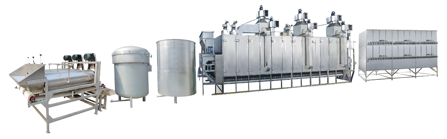 該生產線主要用于加工蒜香、五香、奶香等口味的花生果。是集花生果清洗、蒸煮、入味、烘烤脫水、烘烤干燥及揀選包裝為一體的自動化生產線。